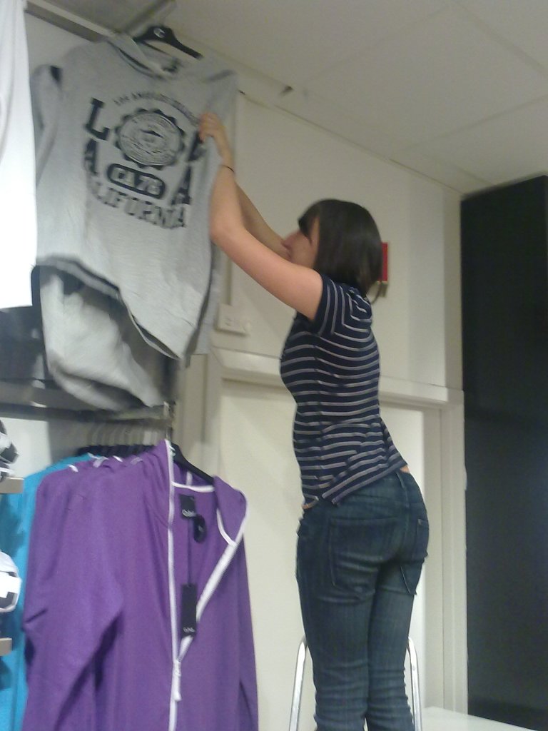 Ich z.b. ließ meiner Leidenschaft, T-Shirts für MartinSchatz zu kaufen, freien Lauf . Was allerdings durchaus mit gewissen Schwierigkeiten verbunden war, befanden sich die guten Stücke doch in einer Höhe, die für MartinSchatz keine, für mich jedoch schon eine Herausforderung war. Und es sieht mit Sicherheit total bescheuert aus, wenn man hüpfenderweise mit einem Bügel versucht, die Grössenschilder zu erkennen bzw wenn man dass dann geschafft hat, die Teile von der Stange runter zu kriegen! Bei einem zog ich schlicht und ergreifend solange, bis es vom Bügel rutschte (klappt nur bei entsprechendem Halsausschnitt!). Aber was tut man nicht alles für den Schnäppchenpreis von 3,50 Euro…