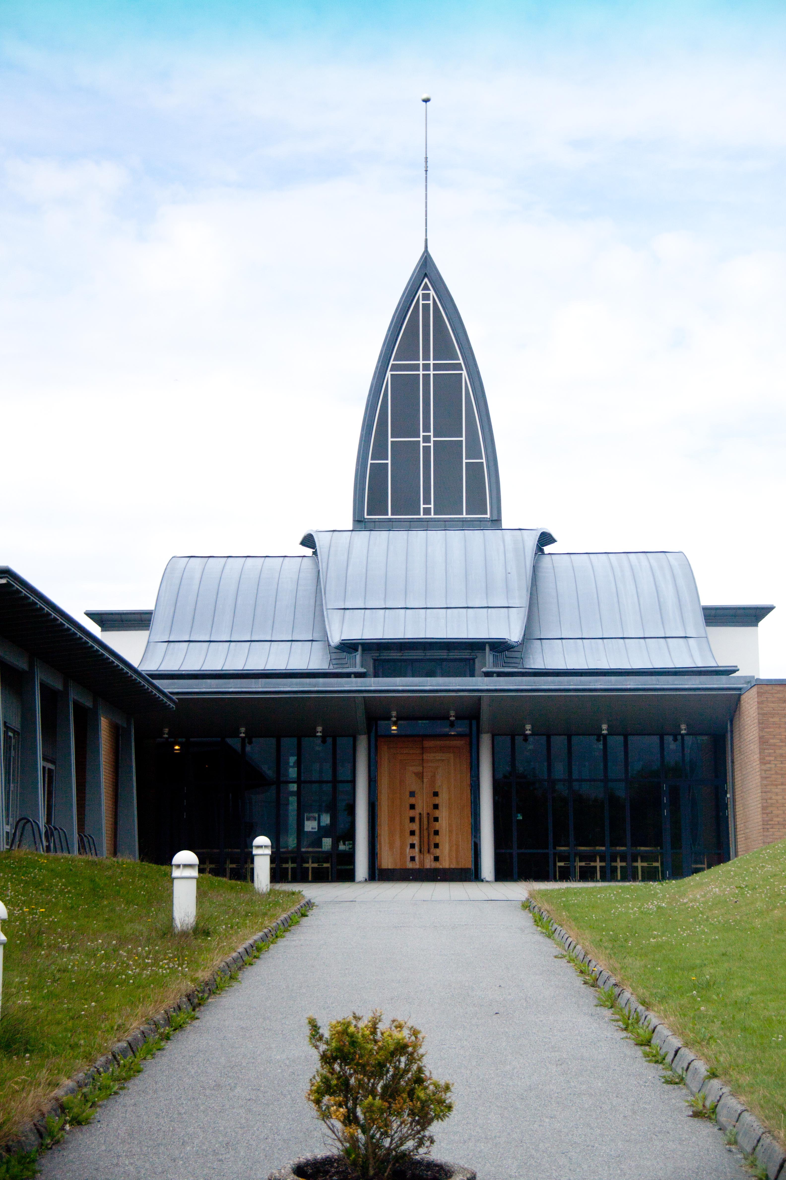 Die Seefahrer-/Bischofsmützenkirche von vorne.. Keine Uhr – und der Glockenturm befindet sich auf der Wiese rechts. Irgendwie habe ich vergessen, ihn zu fotografieren. Aber wir müssen ja sowieso nochmal hin – Ulrike hatte ja keinen Fotoapparat dabei.