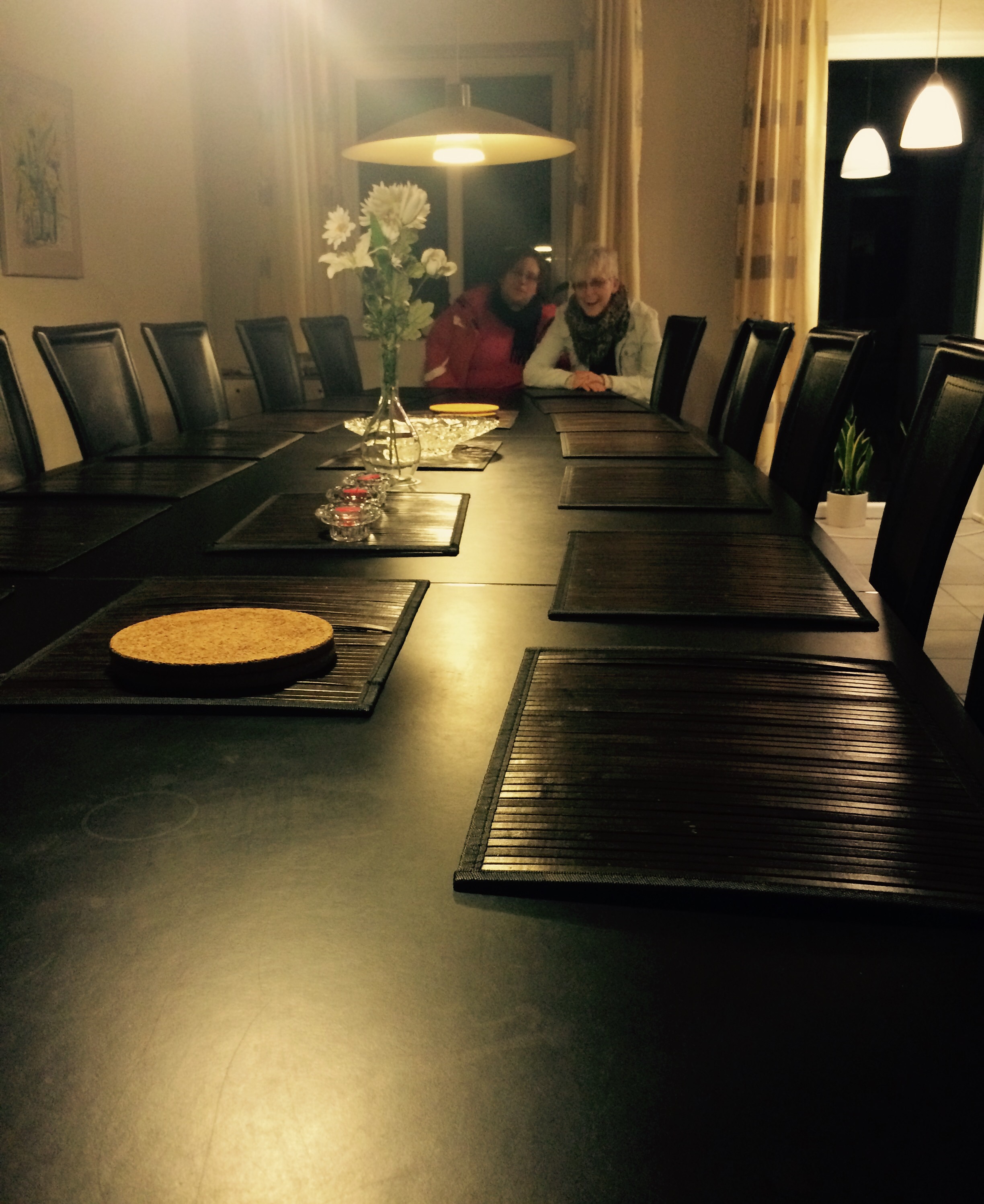 Komplett vereint in Neumünster – wie immer gut gegessen im Rasthaus – Schnee und Nebel hinter der Grenze