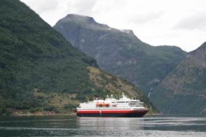 Kreuzfahrtschiff bei der Ausfahrt aus dem Geiranger in den Sunnylvsfjord